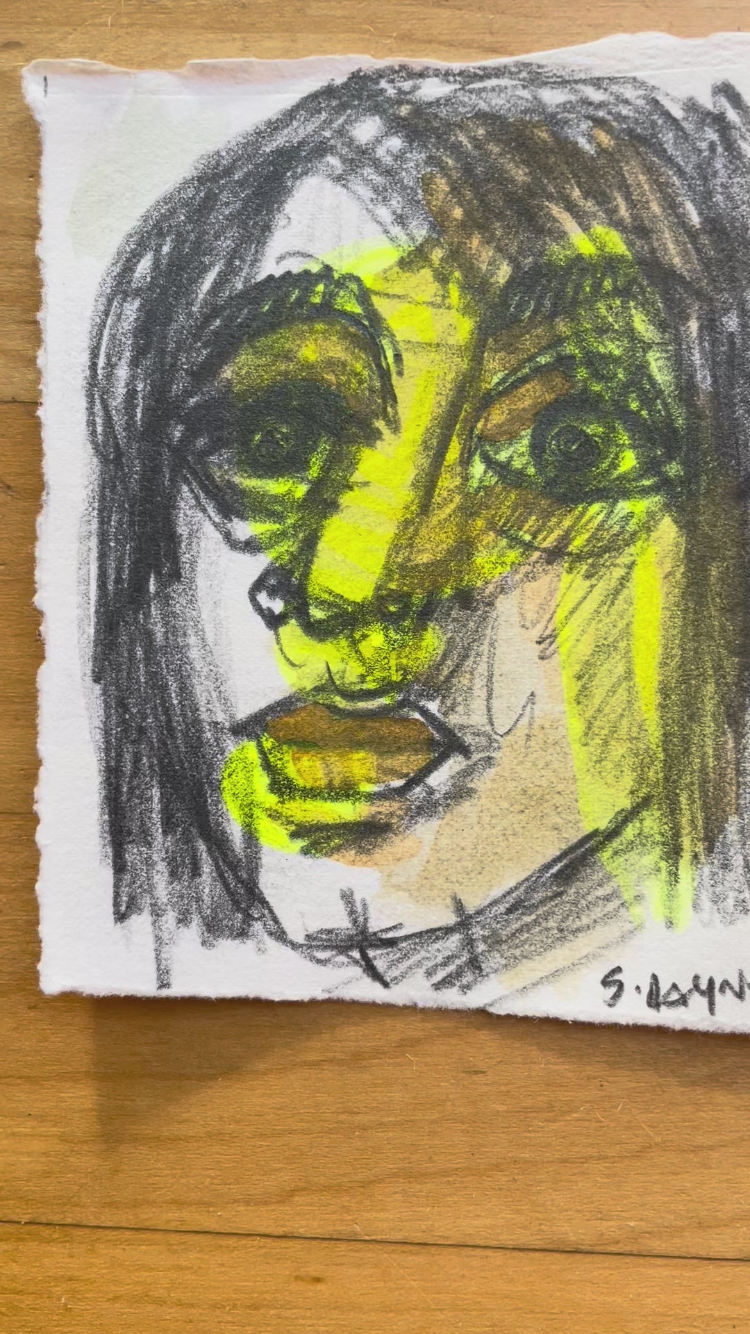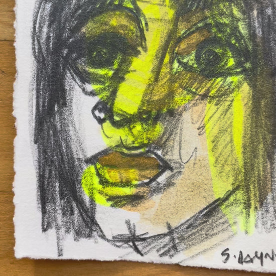 This original 4x4 inch mixed-media drawing captures an expressive portrait of a woman only named with the initials A.N. Layered in bold pencil strokes and luminous yellow ink using heavy weight Rives BFK printmaking paper, the piece radiates intensity and energy. The combination of raw graphite lines and glowing color gives the portrait a striking, almost electric presence.