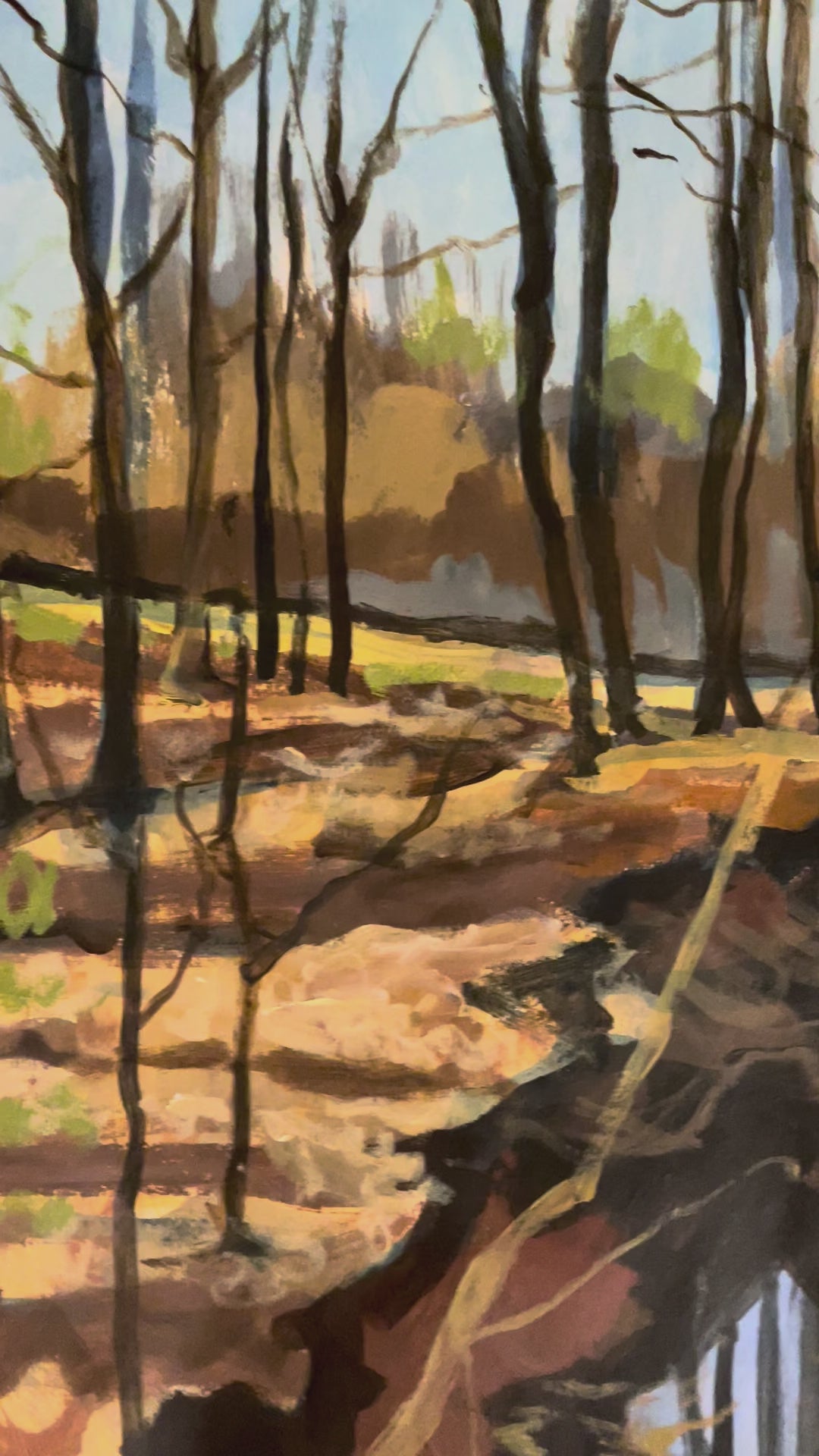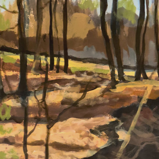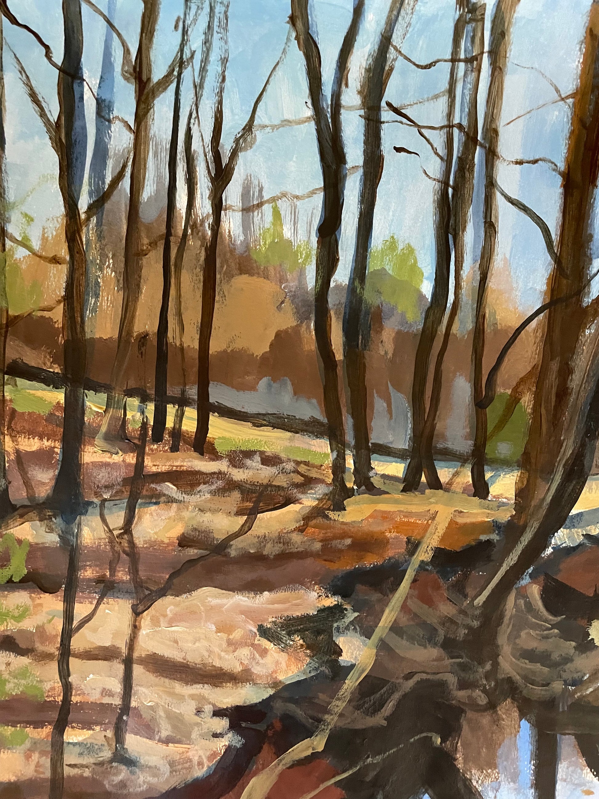 I have recently been hiking at this beautiful and poignant park. Tall winter trees rise like witnesses along a narrow creek, their reflections broken by slow-moving water. Soft light filters through the woods, illuminating patches of earth while deeper shadows pool along the bank, suggesting memory, passage, and the lingering presence of the past. The scene is calm and carries the weight of what once unfolded there. You can really feel the history as you experience the park and hopefully that translates into my painting.