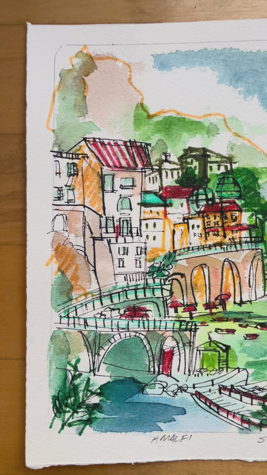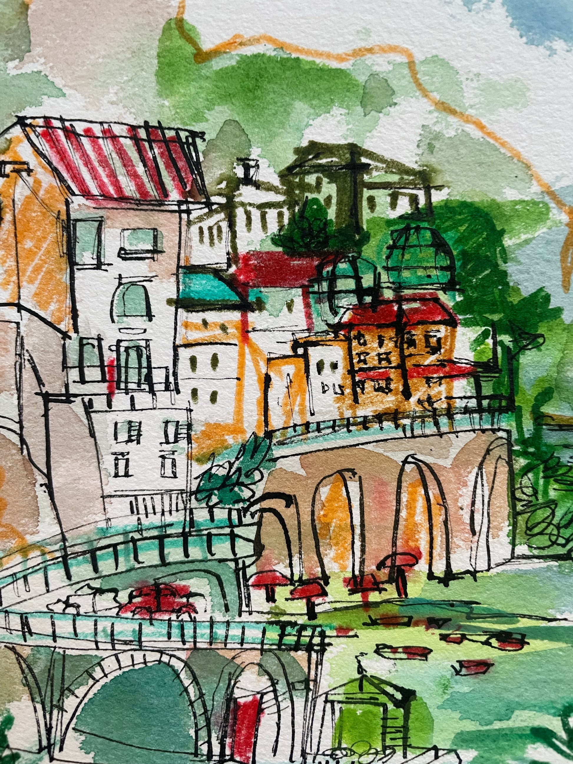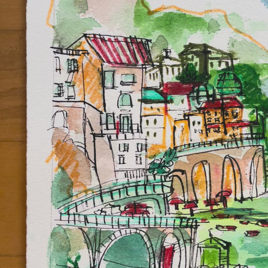 Capture the charm of Italy’s Amalfi Coast with this original watercolor and ink painting. Hand-drawn with expressive linework and washes of vibrant color, this piece brings to life the seaside town’s iconic arches, terraced houses, and Mediterranean energy.