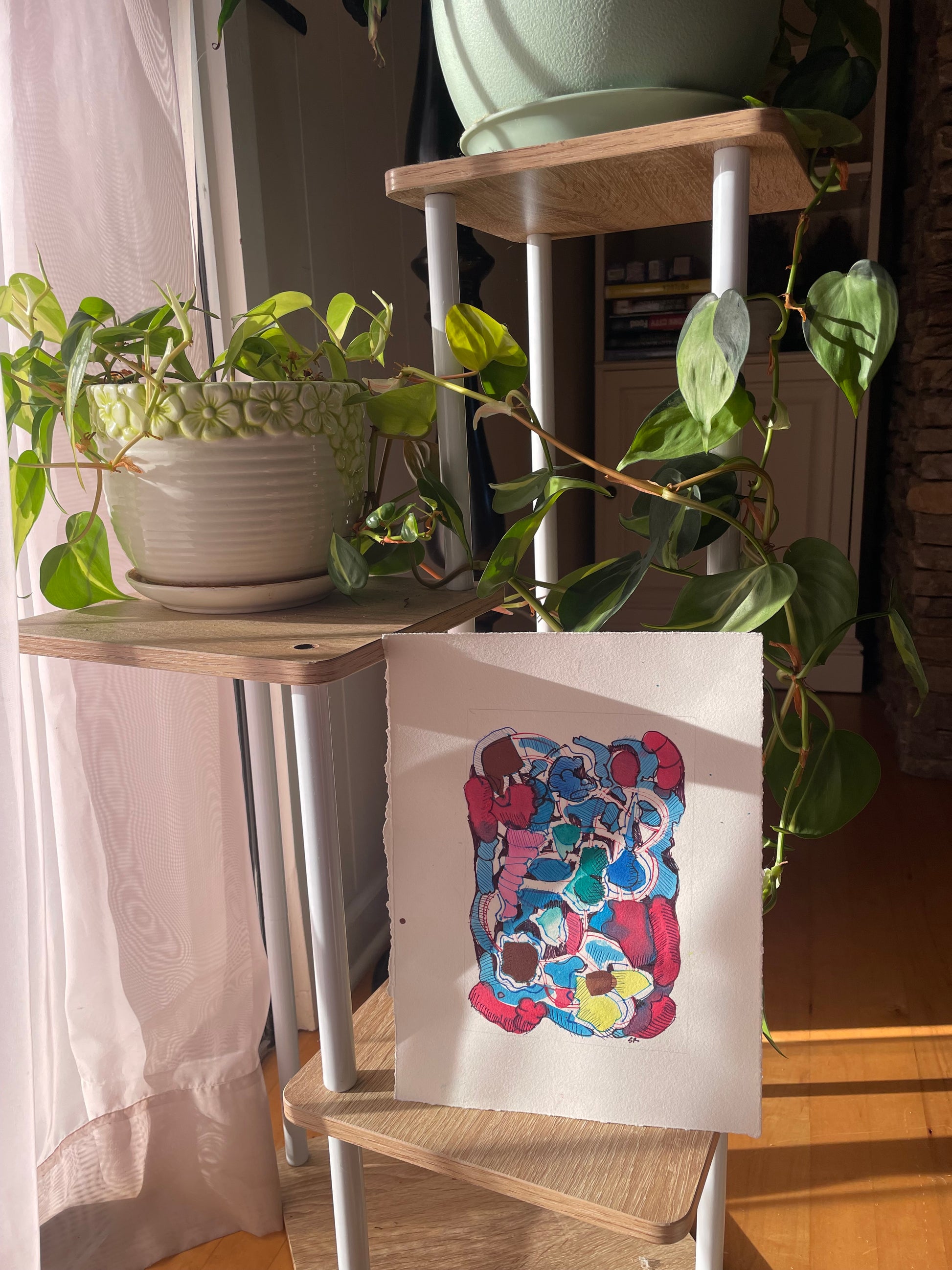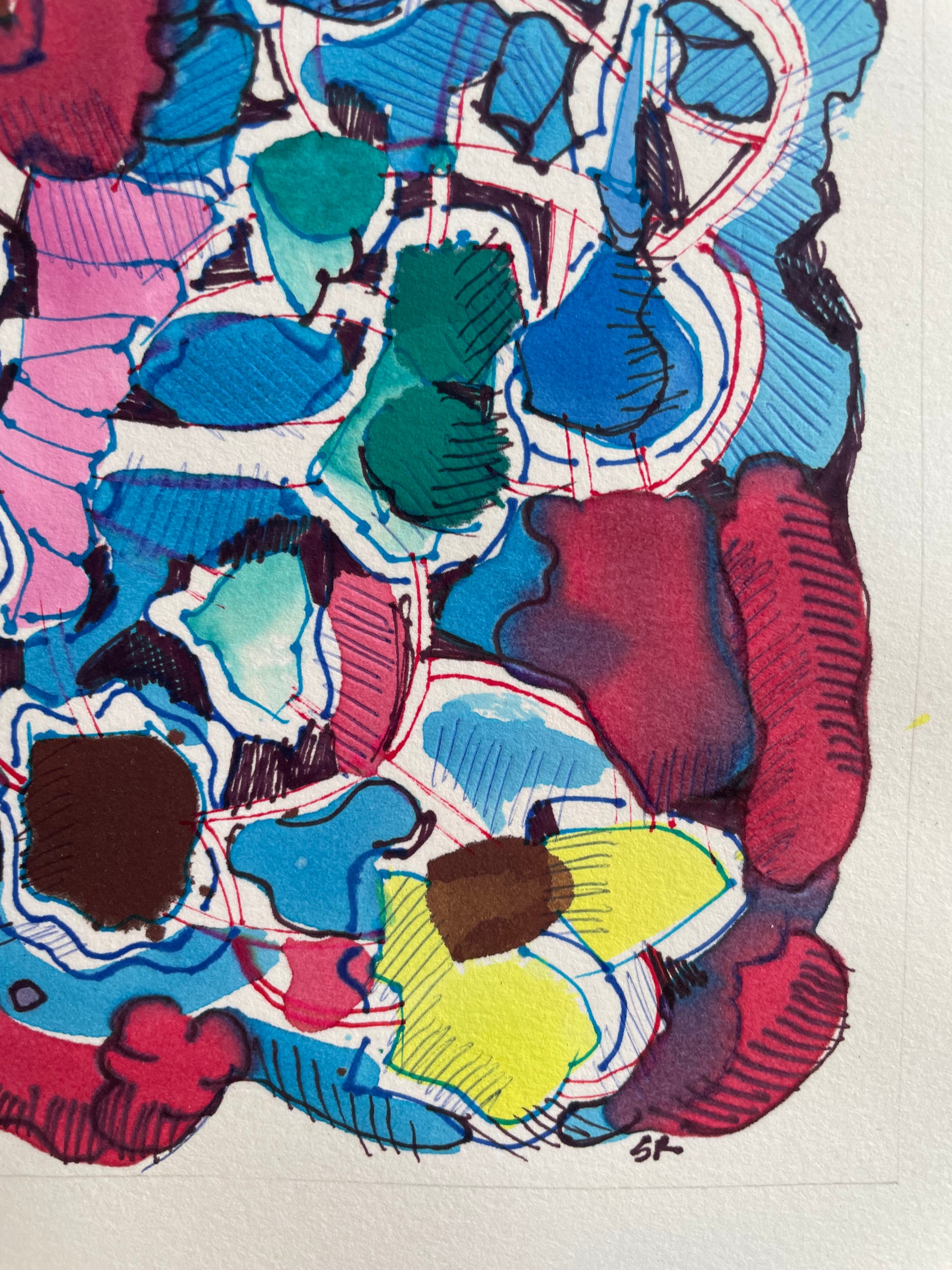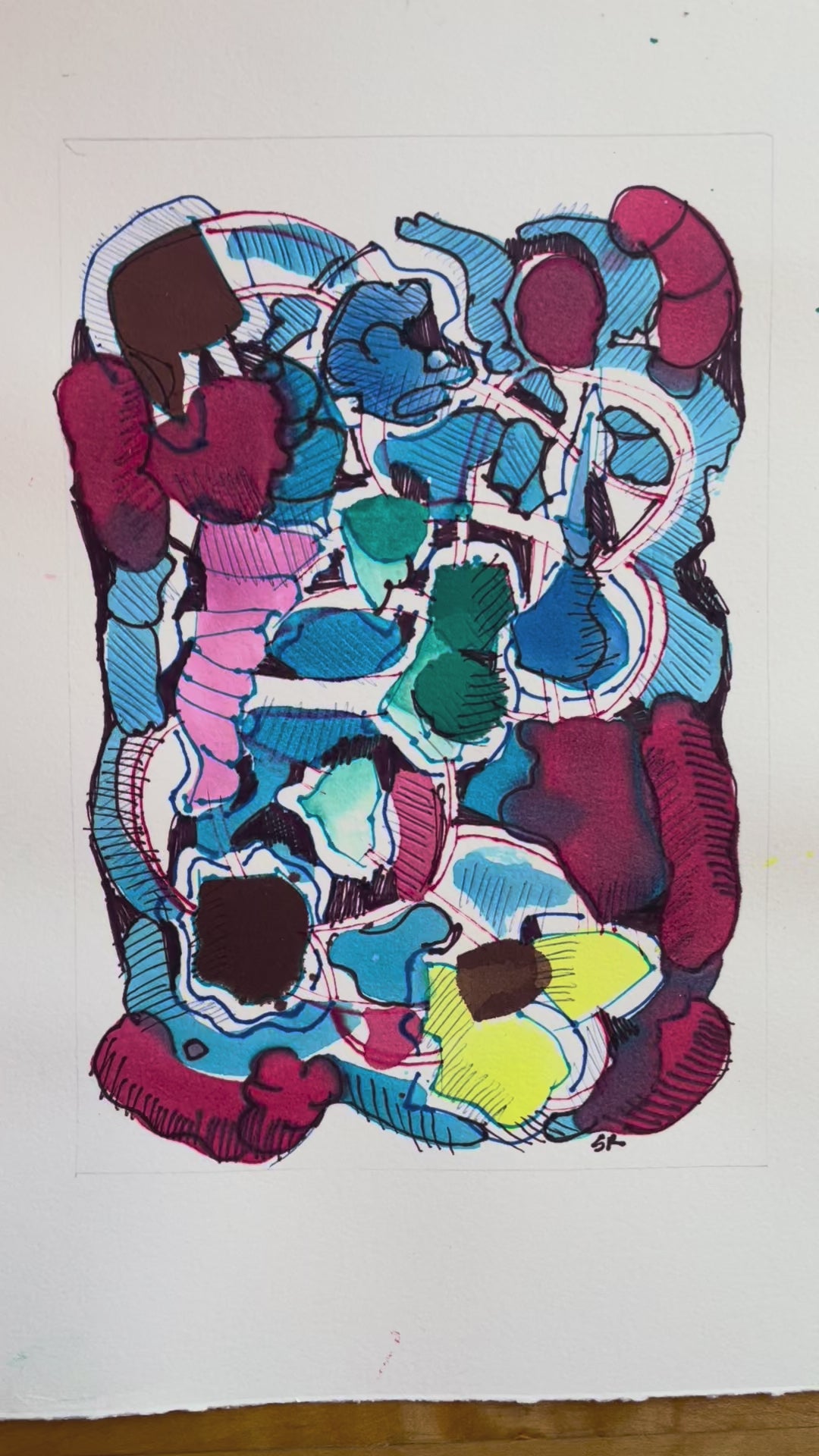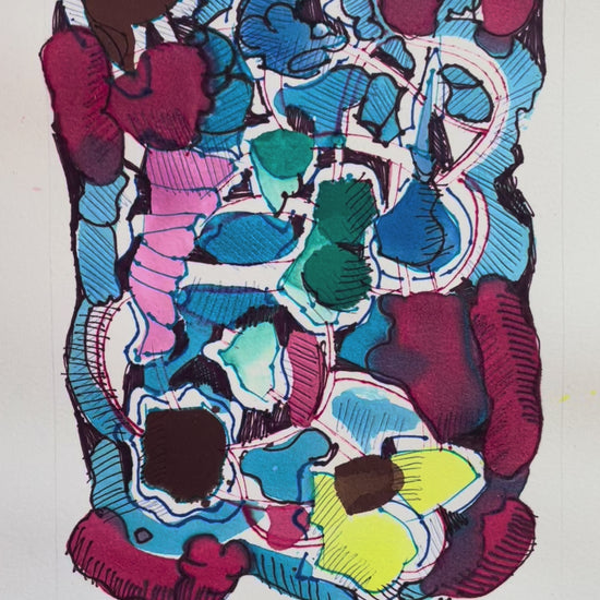 This 5x7 inch original watercolor and ink drawing bursts with color, movement, and layered textures. Created in a non-objective abstract style, the piece blends freeform washes of watercolor with graphic ink linework, resulting in a vibrant interplay of organic shapes and rhythmic patterns.