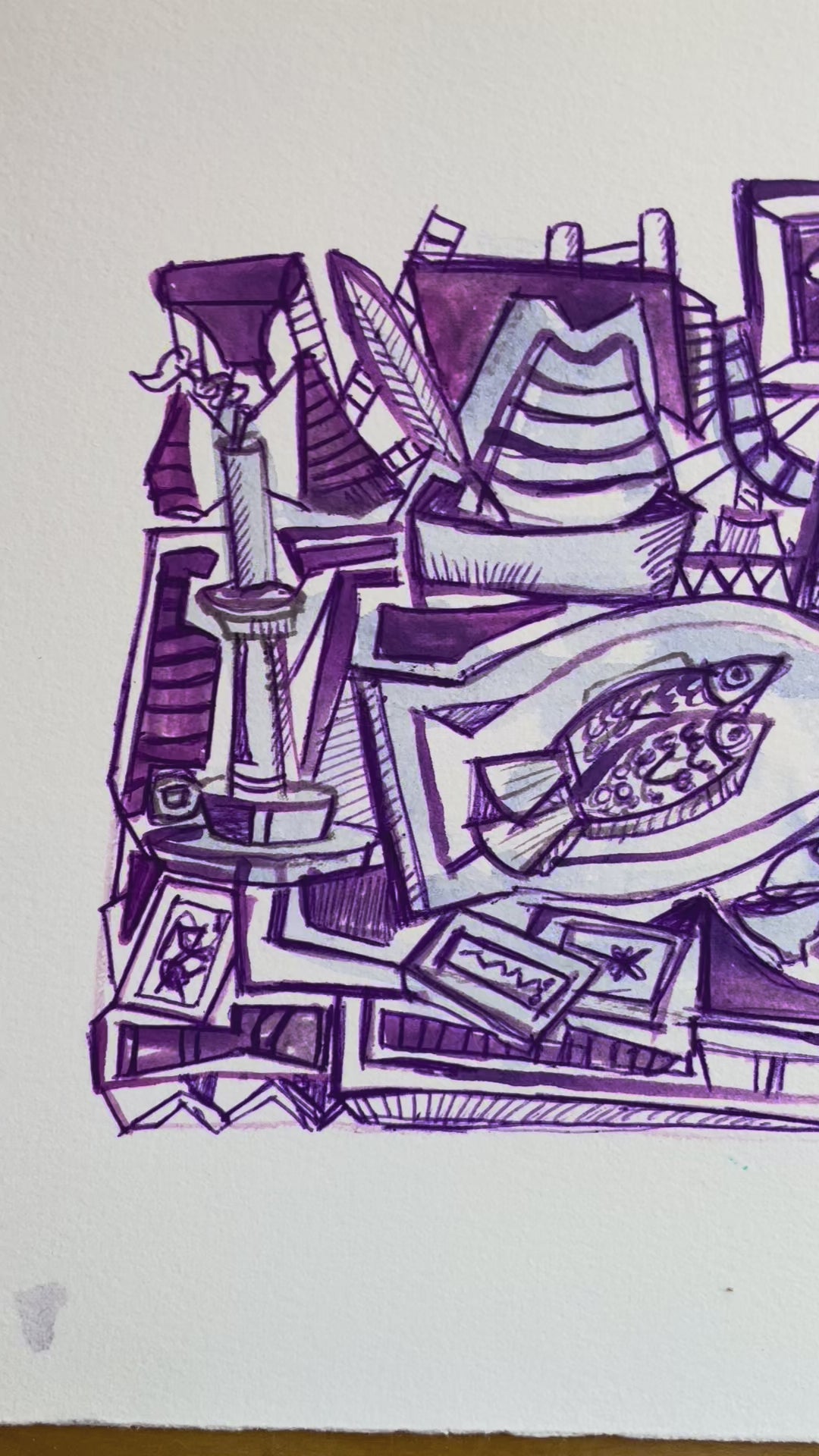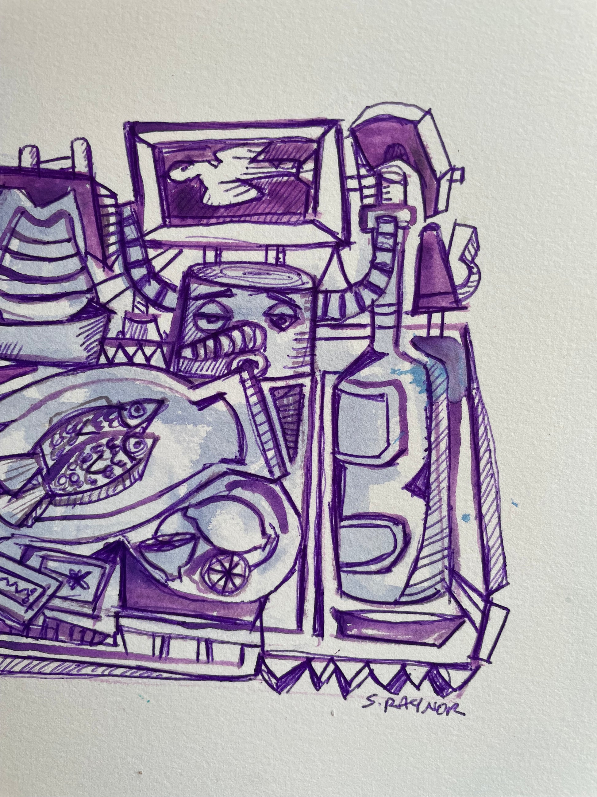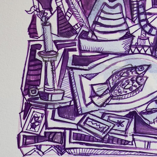 his 5x7 inch original ink and watercolor wash drawing captures a lively, abstracted still life of studio treasures. Rendered in rich shades of purple with bold linework, the piece playfully weaves together everyday objects, from a bottle and books to lemons, fish, and even the iconic hat of Atticus Finch.