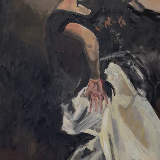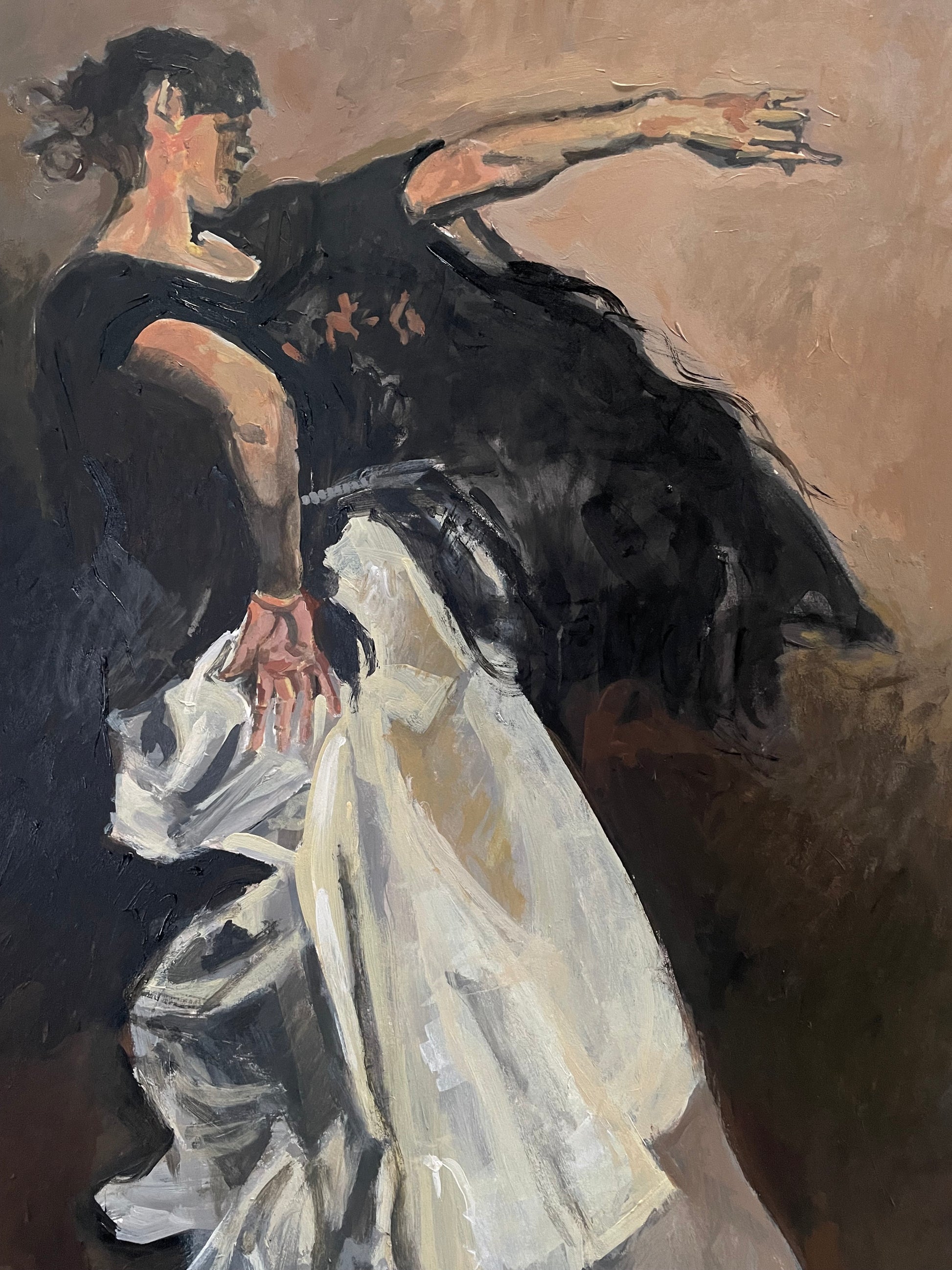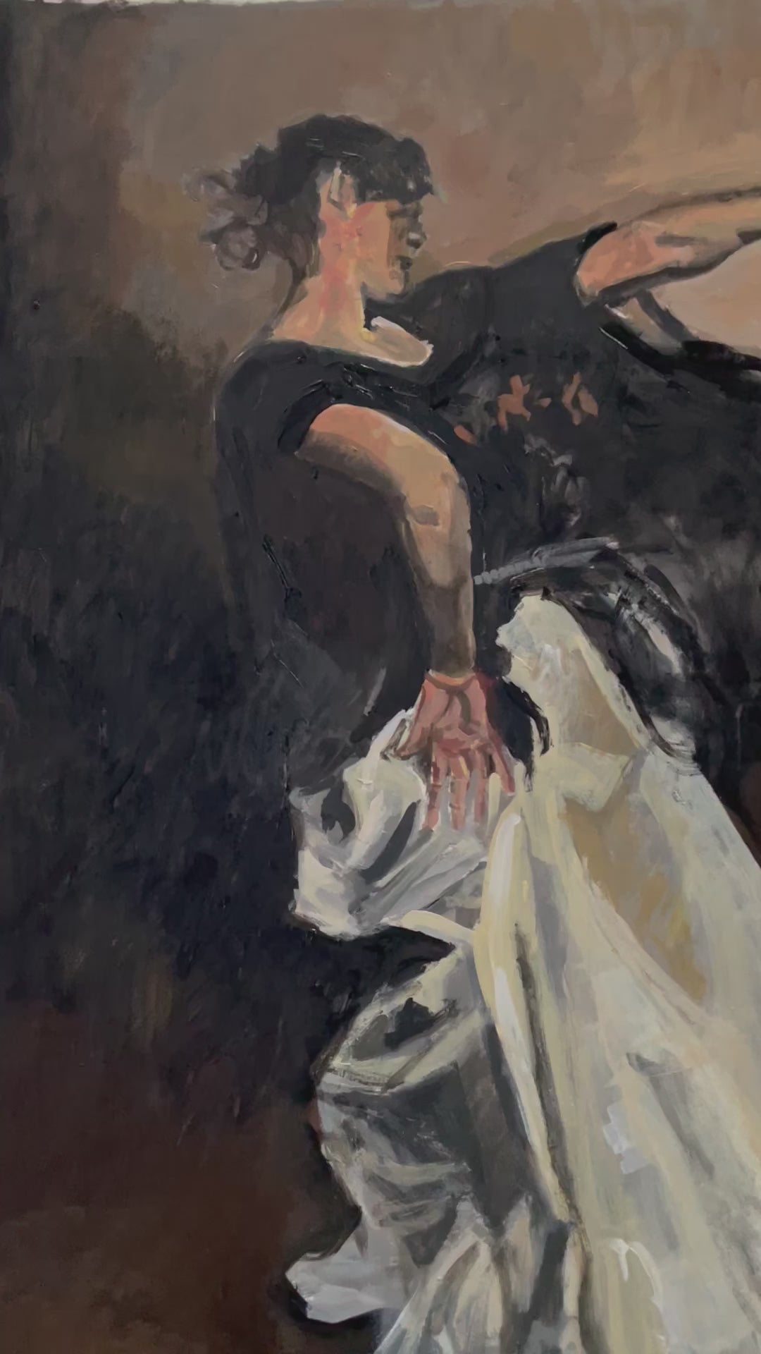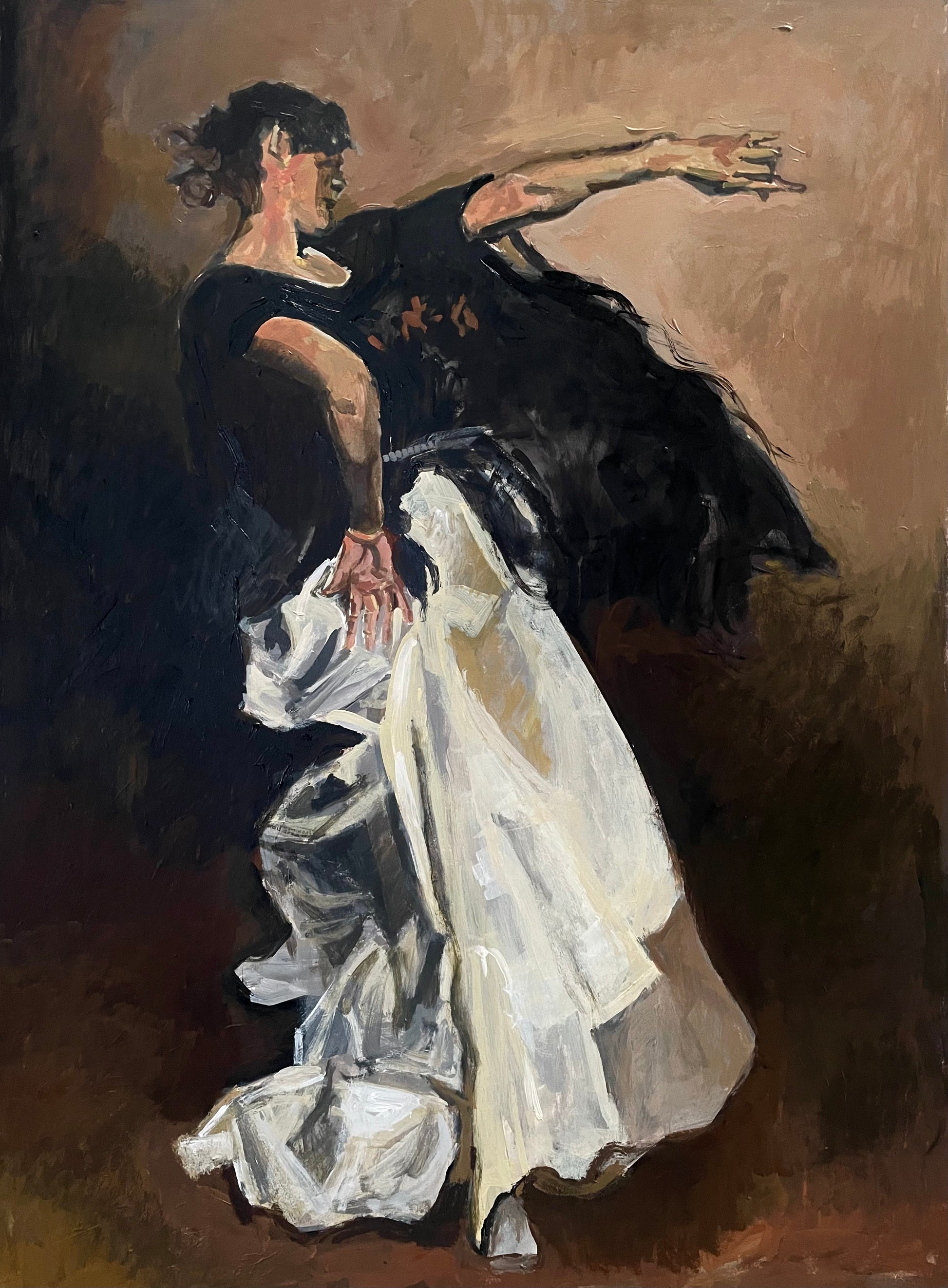 This expressive oil painting is a personal study of John Singer Sargent’s iconic El Jaleo located in the Isabella Stewart Gardner Museum, created as part of an exploration into Sargent’s dynamic brushwork, dramatic lighting, and masterful handling of form. Painted by an artist with over 30 years of experience and more than 70 gallery and museum exhibitions, this piece reflects a deep dive into classical technique through a contemporary lens.