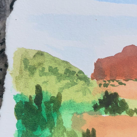 This original 3x5 inch watercolor captures the breathtaking beauty of the red rock formations of Sedona, Arizona. Painted in fresh, luminous washes, the piece conveys the vibrant desert landscape with warm sandstone cliffs rising against a wide blue sky, framed by soft greens of desert vegetation.