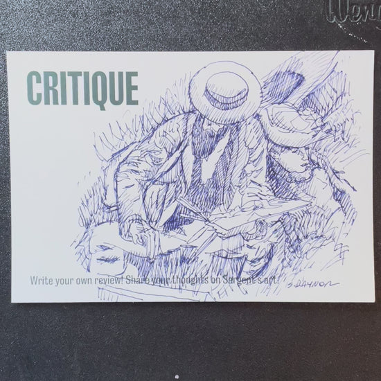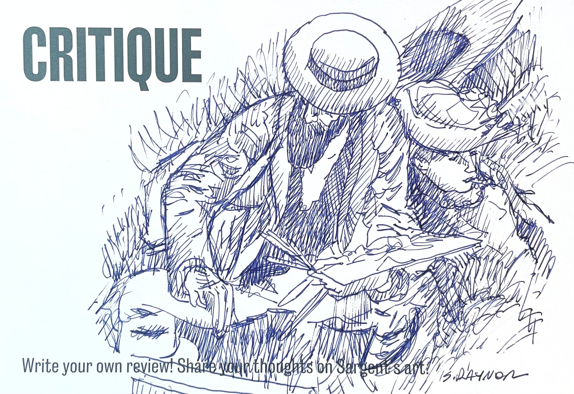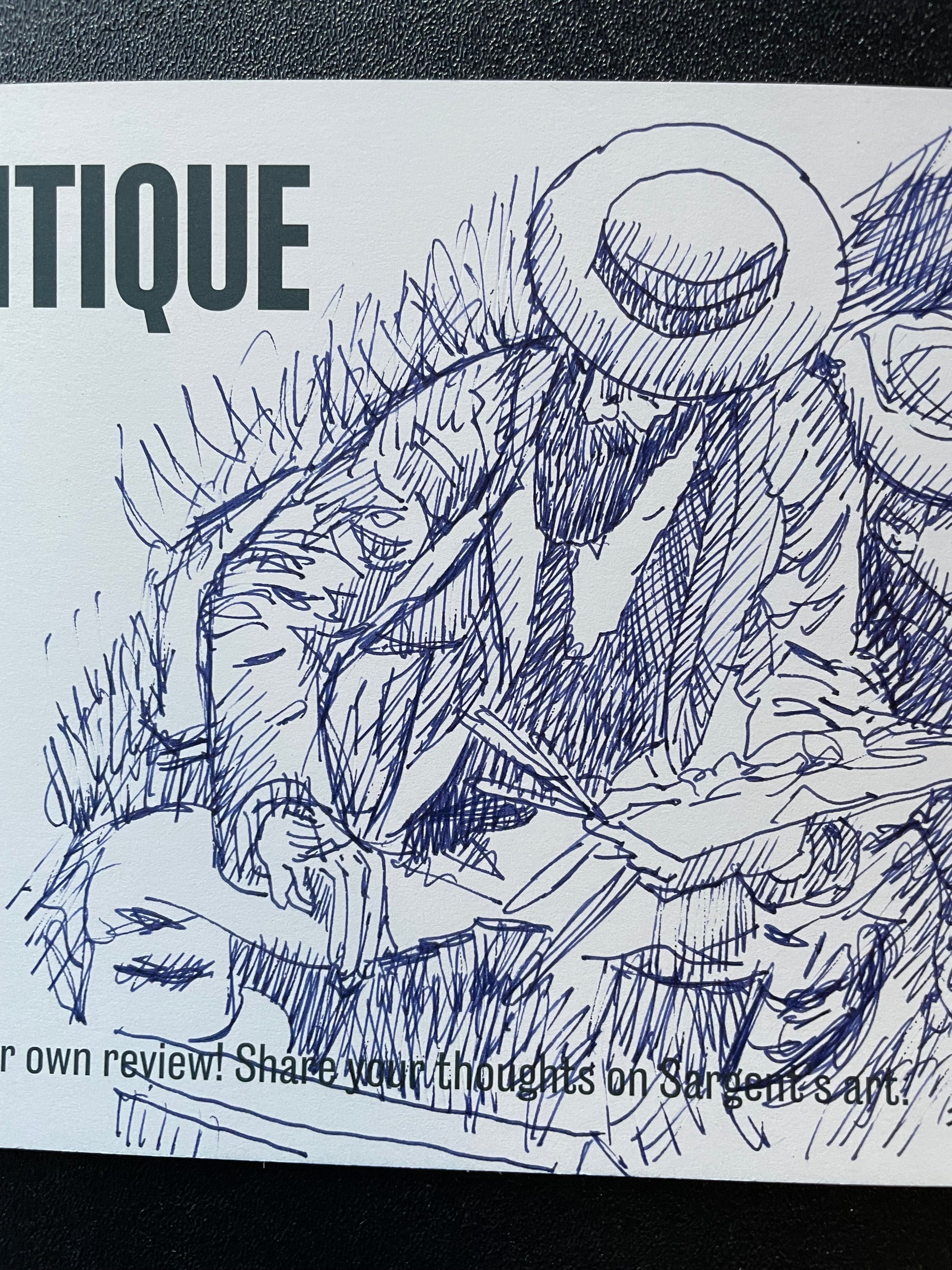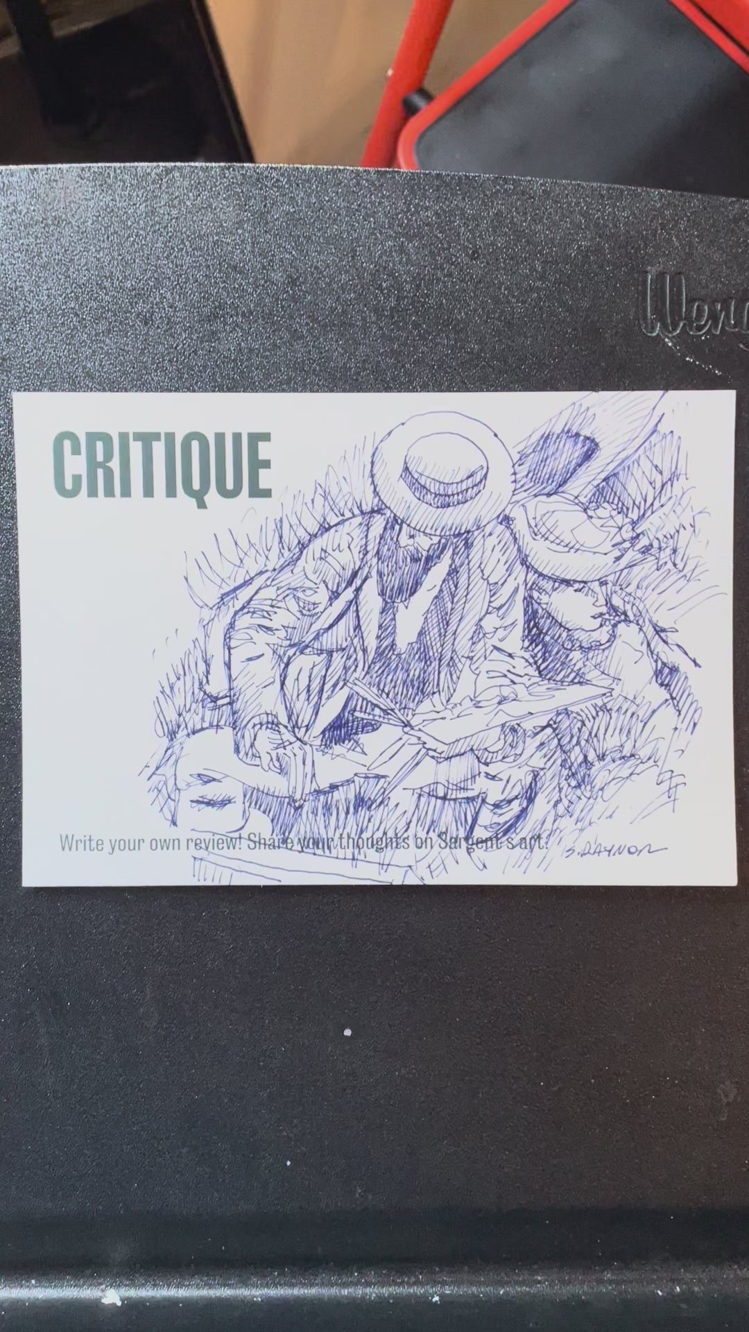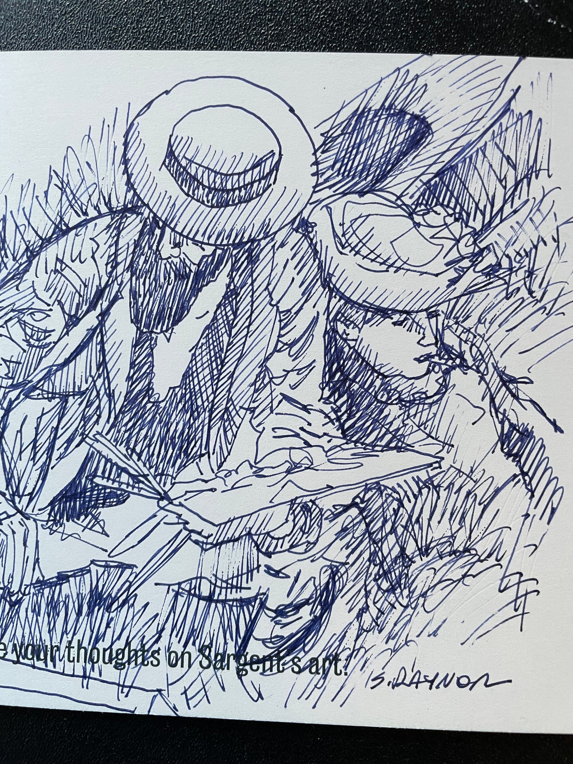 Hand-drawn on an exhibition card, this sketch captures the gesture and presence of a contemplative painter—reminiscent of Sargent’s Parisian period. It invites reflection on how classic works still move us today.
