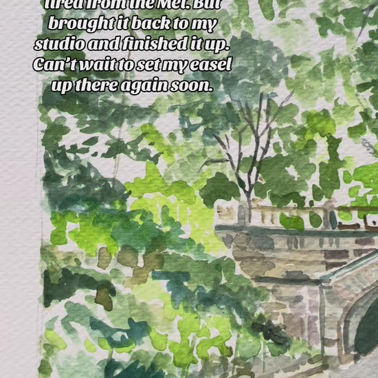 Capture the quiet charm of New York City's most beloved green space with "Spring Light, Central Park," an original plein air watercolor by artist Scott Raynor. Painted on location, this piece features one of Central Park’s iconic arched bridges bathed in dappled sunlight, framed by lush greenery and touched with the quiet presence of a solitary figure in motion.