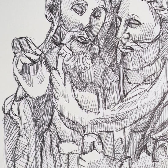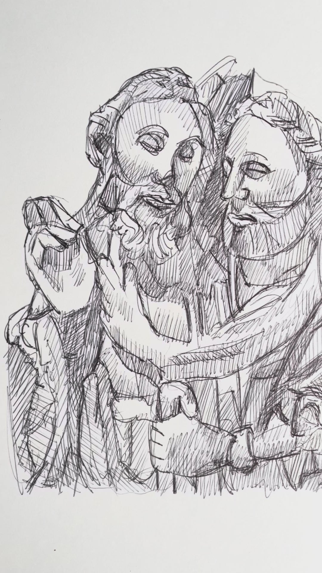 This expressive pen and ink drawing captures the haunting emotional gravity of The Betrayal of Christ, a medieval sculpture from The Metropolitan Museum of Art’s renowned Cloisters collection. Rendered with delicate hatching and bold linear rhythm, the work interprets the stylized solemnity of Gothic stone carving through a contemporary artist’s hand.